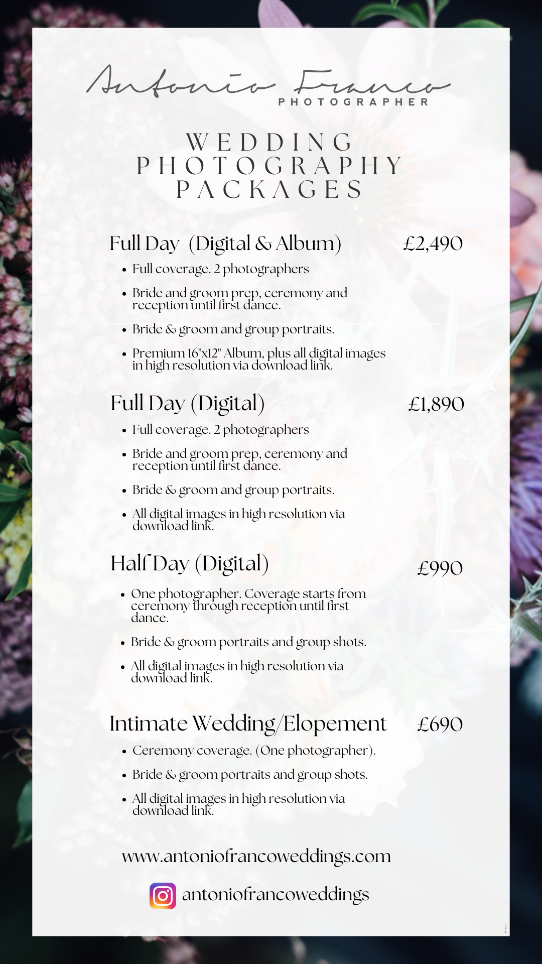 I offer a range of packages tailored to a variety of needs and budgets, all of which promise to deliver images that you’ll cherish forever. However, I understand that every love story is unique and may require a different touch. If you don’t see a package that quite adapts to your specific needs, please don’t hesitate to contact me. I’ll be happy to curate a bespoke package designed specifically for you